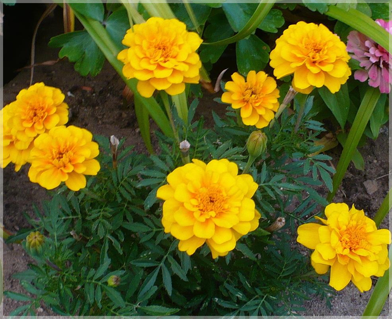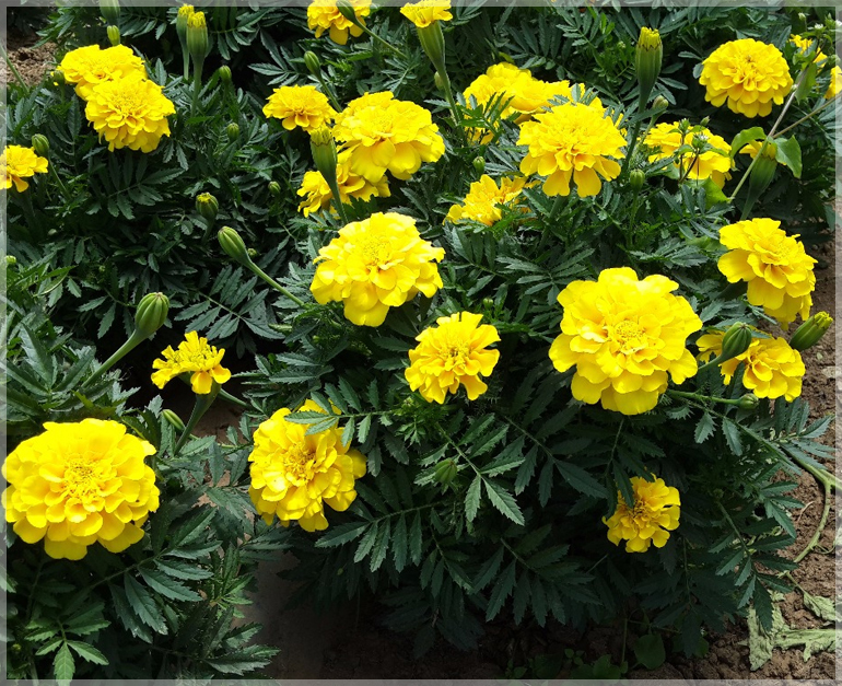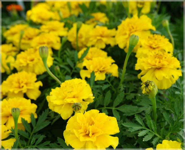 Growing 8–12″ they are just the right height for edging flowerbeds and borders with a chic, neat, little growth habit and elegant dark green foliage. Extremely easy to grow and brightens the garden all summer long. Blooms early summer to frost, even in harsh Northern climates. This is the beautiful and beneficial marigold that repels insects and nematodes, so plant it liberally throughout the garden.
