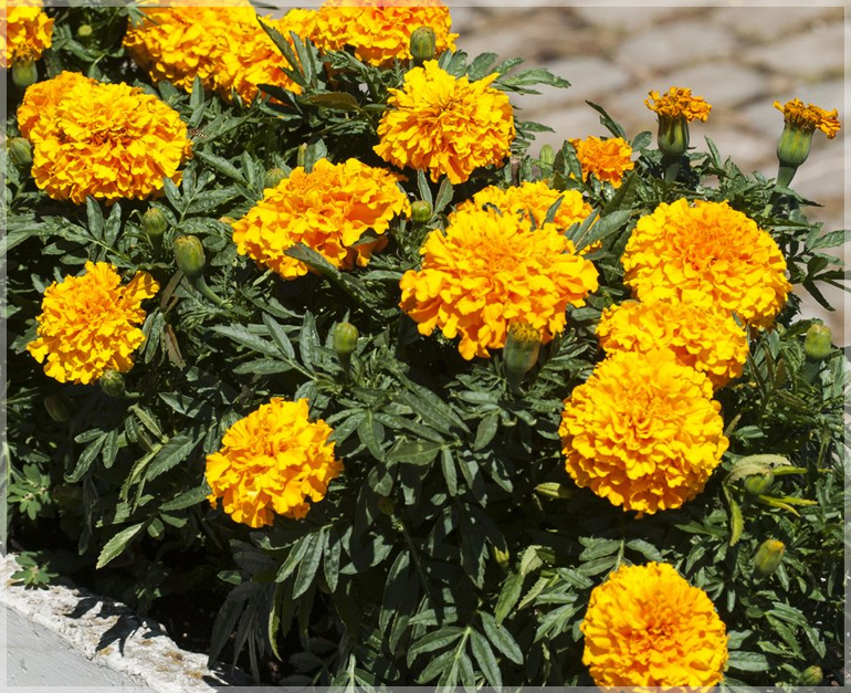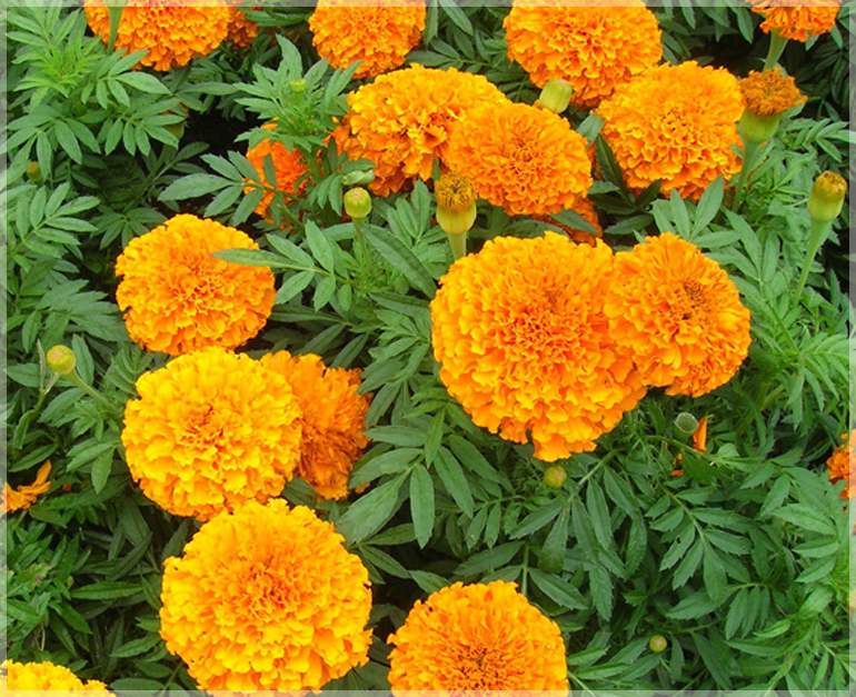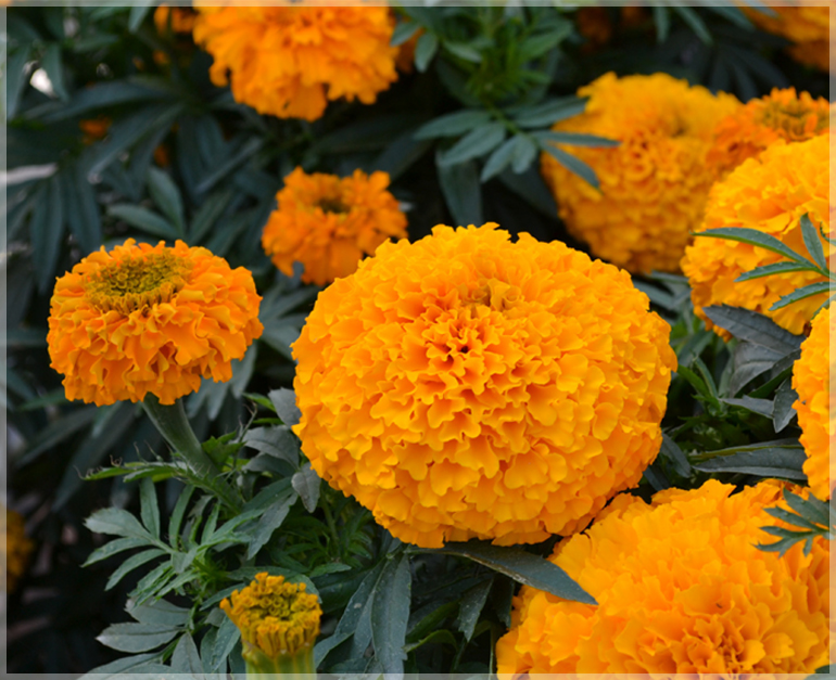 This variety of marigolds looks good when planted in a mass of leaves and blossoms. The bright blossoms create color spots in flower borders. Dwarf marigolds grow well in containers when planted around the edges. Plant these marigolds with other low-growing, summer-blooming annuals.